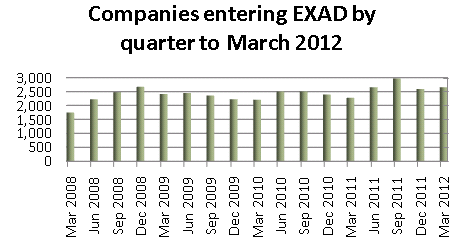 Companies entering EXAD increased from 518 in January (2012) to 1,123 in February then fell slightly to 1,014 in March. January appointments reflect the fall off in activity normally associated with the Christmas/New Year holiday period.