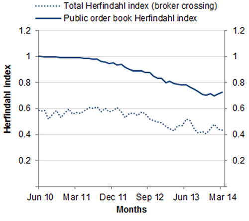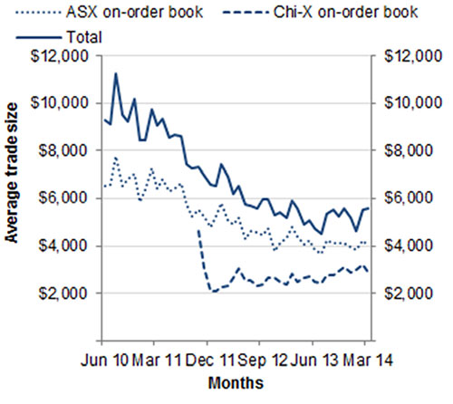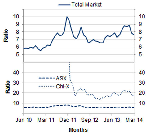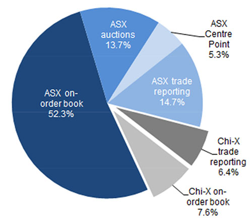 Over the March quarter 2014, the ASX accounted for 86% of the total dollar turnover in equity market products. Chi-X accounted for the remaining 14% of total dollar turnover. These figures include all trades executed on order book, as well as trades matched off order book and reported to either market operator.