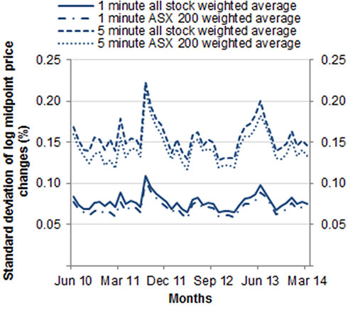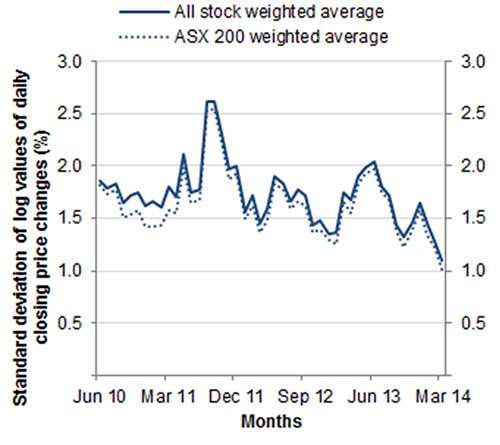 Overall daily turnover in the equity market averaged $4.8 billion over the quarter. The average trade size remained unchanged at $5,300 from the previous quarter. The weighted average quoted bid–ask spread for securities in the ASX 200 index fell marginally to around 14 basis points of the midpoint price. The weighted average quoted bid–ask spread for all securities also dropped to just below 21 basis points of the midpoint price. Quarterly average intraday and interday volatility was lower in the March quarter.